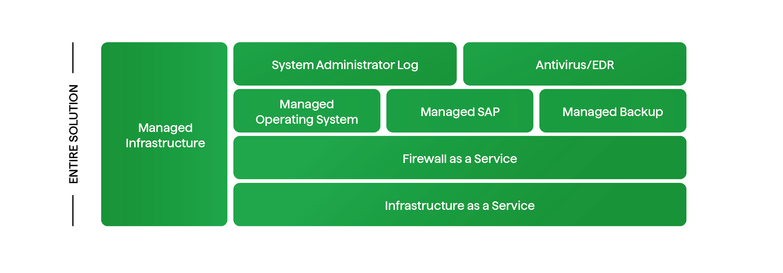In addition to the infrastructure management services already provided by IaaS, the provision and management of the more specialized components of the IT stack, such as operating system, backup, EDR, logging and advanced monitoring, as well as system support of the SAP component, make up the package. All Datacenter infrastructure components supporting Service delivery are controlled by our Next Generation SOC.